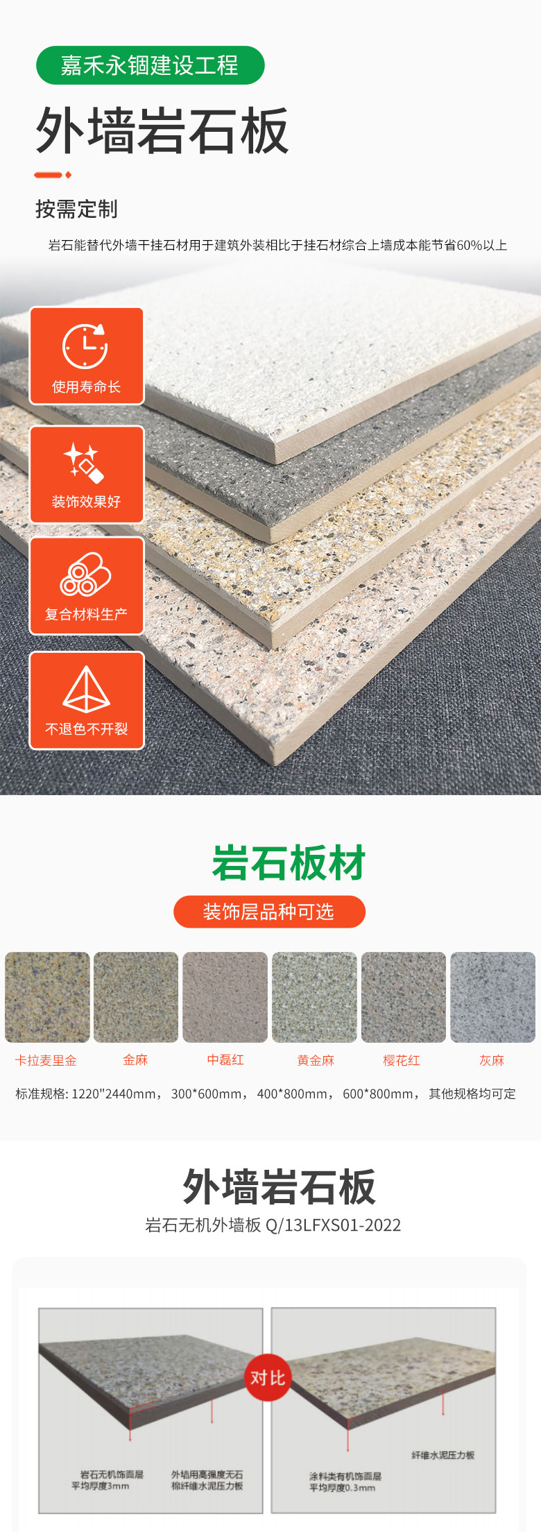外墻巖石板是采用石材經(jīng)過特別工藝切成10mm左右厚度的面層后復(fù)合保溫材料,壽命一般可以和建筑物相同。